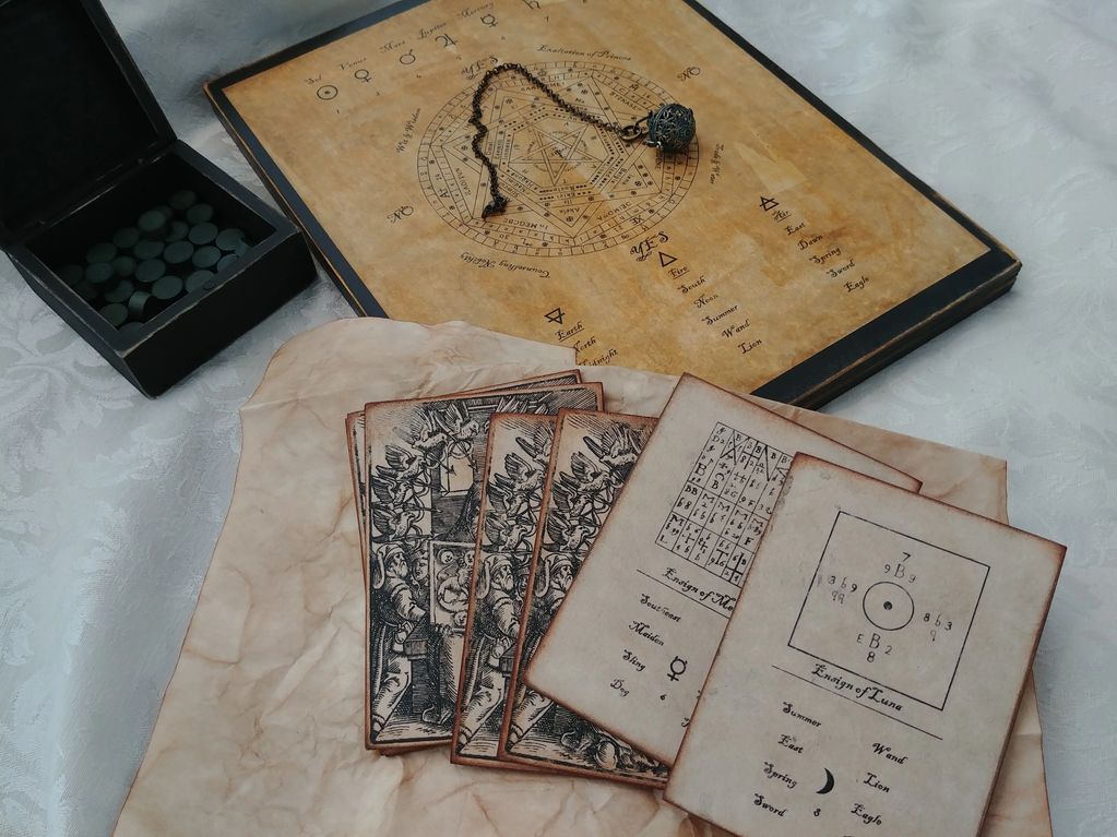 Original Calaveras sets. These included 10 hand made Calaveras cabinet style cards, aged card box, bandana casting cloth, wooden pendulum board, pendulum, and printed manual.