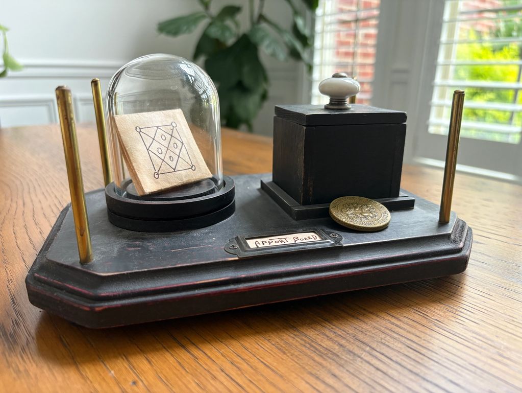 The Arcana Hermeticus, a joint project with Dr. Todd Landman. Included was the hinged board, a chamber pendulum, cabinet cards in a parchment wrap, and wooden game markers. A printed manual was included and the set was shipped in a custom slipcase (by Becki).